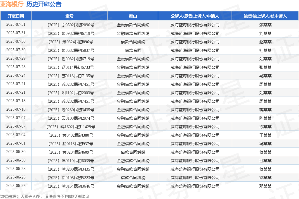 案号:(2025)沪0104民初10571号审理法院:上海市徐汇区人民法院案由:金融借款合同纠纷当事人信息: 原告/上诉人:威海蓝海银行股份有限公司 被告/被上诉人:张某某开庭日期:2025年6月18日根据统计,近一年内以威海蓝海银行股份有限公司为当事人的历史开庭公告有231则,其中案由为“金融借款合同纠纷”的公告以147则居首,其次为“借款合同纠纷”有72则,“追偿权纠纷”有6则。历史开庭公告(前20条)如下: